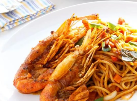22. Heat oil in a pan. Sauté garlic, squid and prawns.